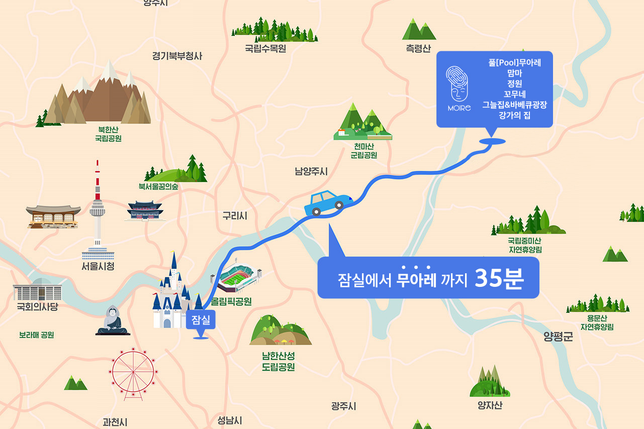 경기도 청평면 북한강로에 위치한 MOIRE는 서울 잠실에서 차로 이동시 30분정도 걸리는 가까운 거리에 있어 시간적